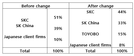 SKC (CEO Park Jang-suk) said, on March 13, that it had signed a contract with TOYOBO, Japan’s specialized maker of high-performance materials, _ base_d on the latter’s stake investment in SKC Jiangsu Hightech Plastics, SKC China’s film plant. TOYOBO will secure a 15 percent stake in SKC Jiangsu Hightech Plastics, and thus become the third largest stakeholder in the Chinese operation, after SKC and SKC China. SKC Jiangsu Hightech Plastics was established in Nantong City, Jiangsu Province, China, in August 2011, with the aim of gaining the upper hand in China’s PET (polyethylene terephthalate) market. The company was launched as a joint venture by SKC China, and its Japanese client firms invested a 10 percent stake. After its establishment, the company began construction of a production plant, which is slated to open in this year’s second quarter.