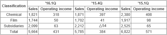● Following the transfer of the Polyol business to MCNS, which was founded in July 2015, sales decreased by 17.0% to 566.4 billion won while the operating income decreased by 24.5% to 43.1 billion, compared to the same period in the preceding year. However, the company posted a stable operating income ratio of 7.6% as its operating income increased by 12.2% over the preceding quarter.