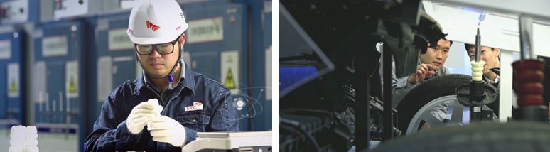 <An SKC employee is examining a polyurethane auto part (left) used in the suspension (right). The product is a key component of the automobile suspension, which absorbs shocks from the wheels and dampens the vibration and noise.>