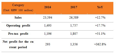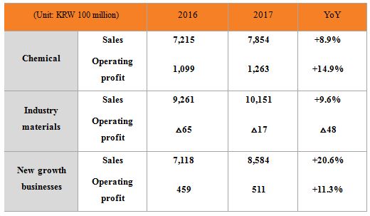 By individual business field, the chemical division recorded sales of KRW 785.4 billion and operating profit of KRW 126.3 billion. Amidst the increased cost and fiercer competition, the company's own efforts such as boosted sales quantity of high-value PG, cost reduction campaign, and preemptive response to regional price fluctuation resulted in improved performance compared to 2016. Sales increase rate was 8.9%, whereas operating profit posted a growth rate of 14.9%.