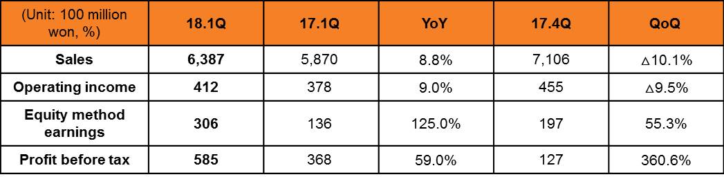 SKC (CEO Wanjae Lee) posted sales of KRW 638.7 billion and operating income of KRW 41.2 billion in Q1 2018, representing an increase of 8.8% and 9.0% respectively over the first quarter of last year. The company also posted a pre-tax profit of KRW 58.5 billion, an increase of 59.0% over the same period of the preceding year, thanks to the improved performance of its key invested companies, including MCNS and SKC-Kolon Polyimide Inc. As a result, the company’s debt ratio has declined to 128.4% compared to the previous year, although it has invested heavily in its new transparent PI film equipment and semiconductor chemicals joint ventures in China.