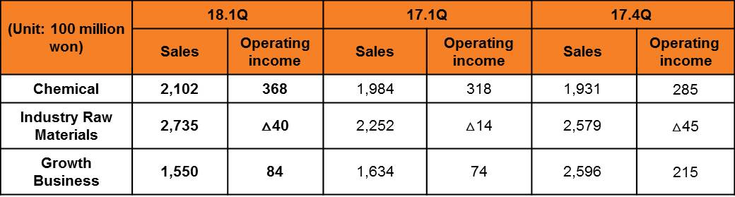 Looking at the figures by division, the Chemicals Division posted sales of KRW 210.2 billion and operating income of KRW 36.8 billion. This is primarily attributable to the increase in production volume after the completion of temporary repair work late last year, while the production volume of high value-added products increased with the growth of high value-added downstream industries.