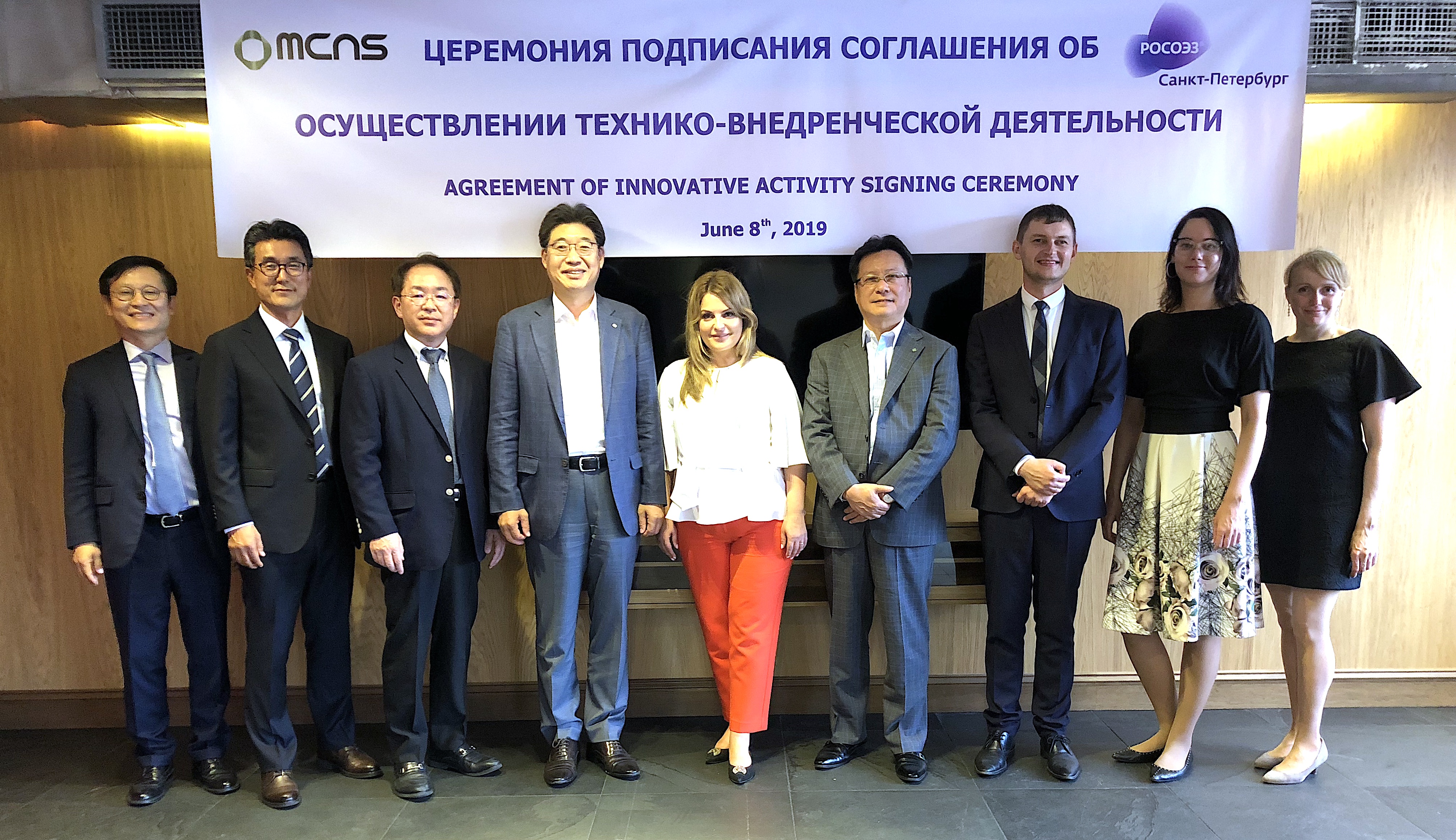 [MCNS signed an agreement on the advancement of MCNS with officials of the city government and the president of the special economic zone in Saint Petersburg, Russia: Eui Joon Lim, CEO of MCNS (fourth from left), Tamara Rondaleva, CEO of SEZ of Russia (fifth from left), Shingo Shibata, Co-CEO of MCNS (sixth from left) and Andrey Ivanov, Vice President of SEZ (seventh from left).]