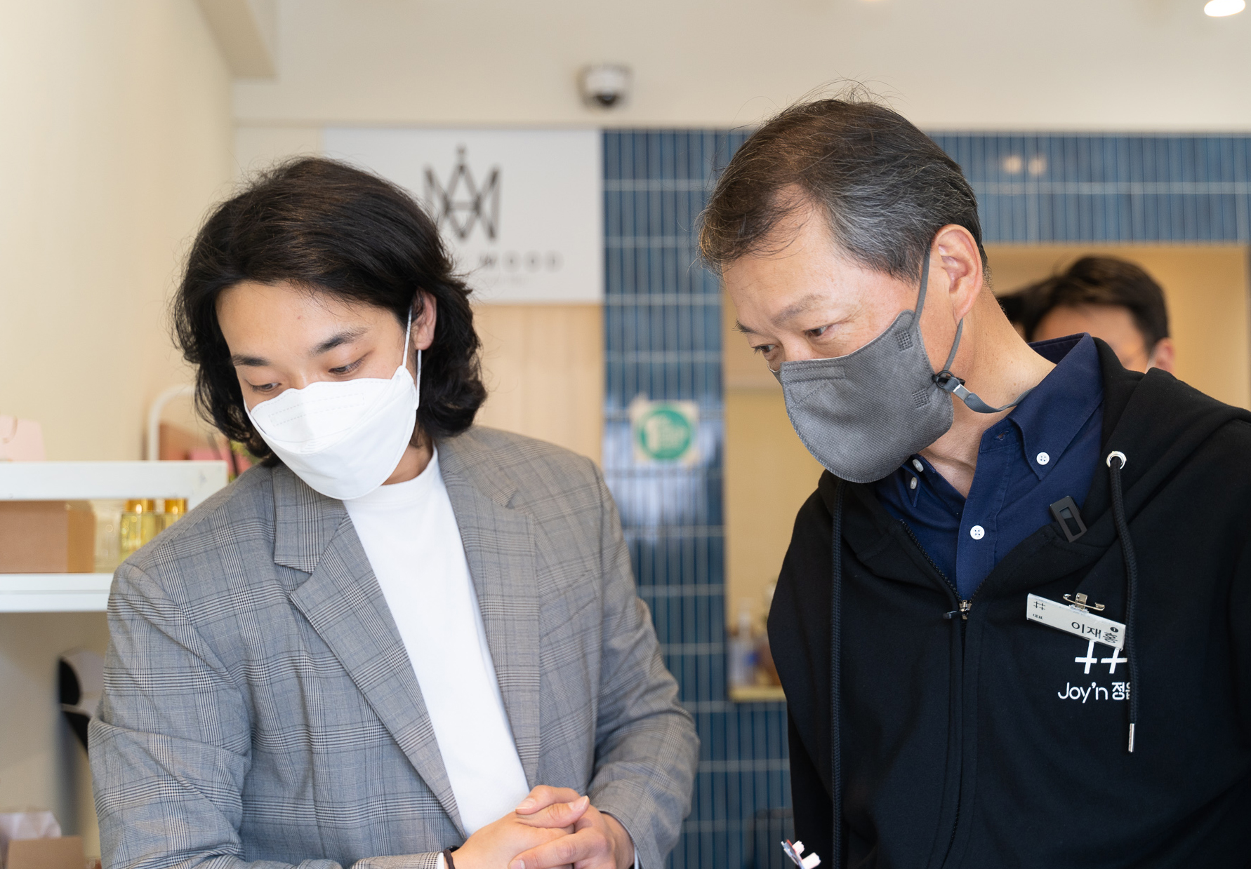 [이재홍 SK넥실리스 대표(오른쪽)와 조인정읍 공유가게 2호점 아로마무드의 안태양 대표가 아로마무드
